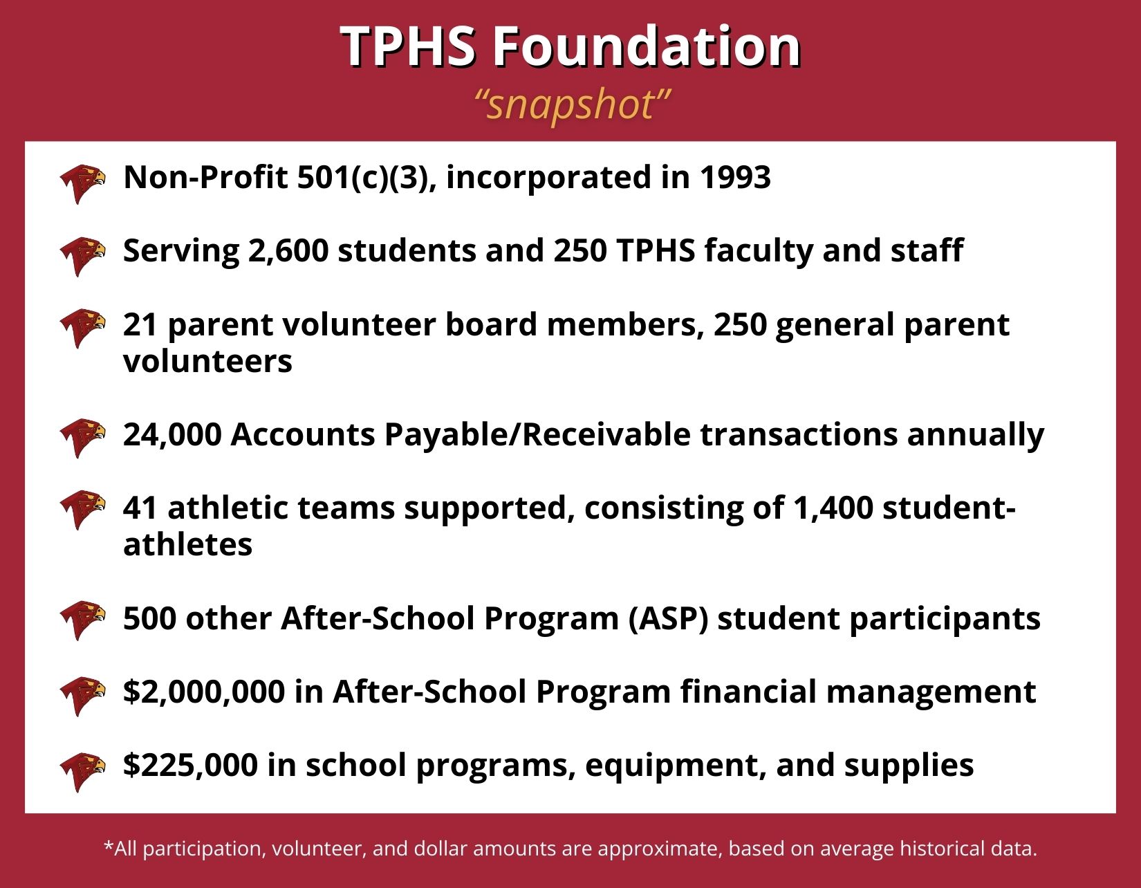 The Foundation is governed by a volunteer Board of Directors elected annually, composed of parents of current students (and up to 3 alumni/alumni parent community members), the school Principal as a non-voting advisor, and one ASB student representative liaison.