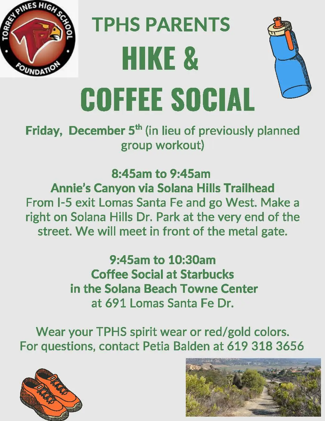 8:45am-9:45am Meet at Annie's Canyon via Solana Hills Trailhead. From I-5 exit Lomas Santa Fe and go West. Make a right on Solana Hills Dr. Park at the very end of the street. We will meet in front of the metal gate. 9:45am-10:30am Coffee Social at Starbucks in the Solana Beach Towne Center. 691 Lomas […]