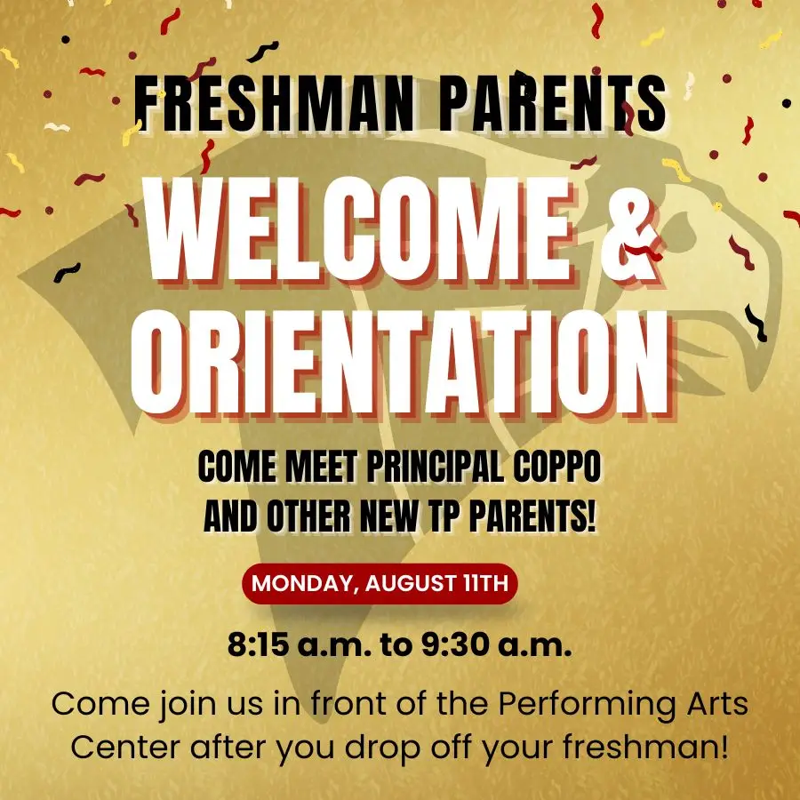 Welcome Freshman Parents - Drop off your new falcon and come meet other new TP parents in front of the Performing Arts Center for coffee and parent resources. Principal Rob Coppo will be speaking to our incoming parents and providing you with the information that you need to start of the Fall semester strong!